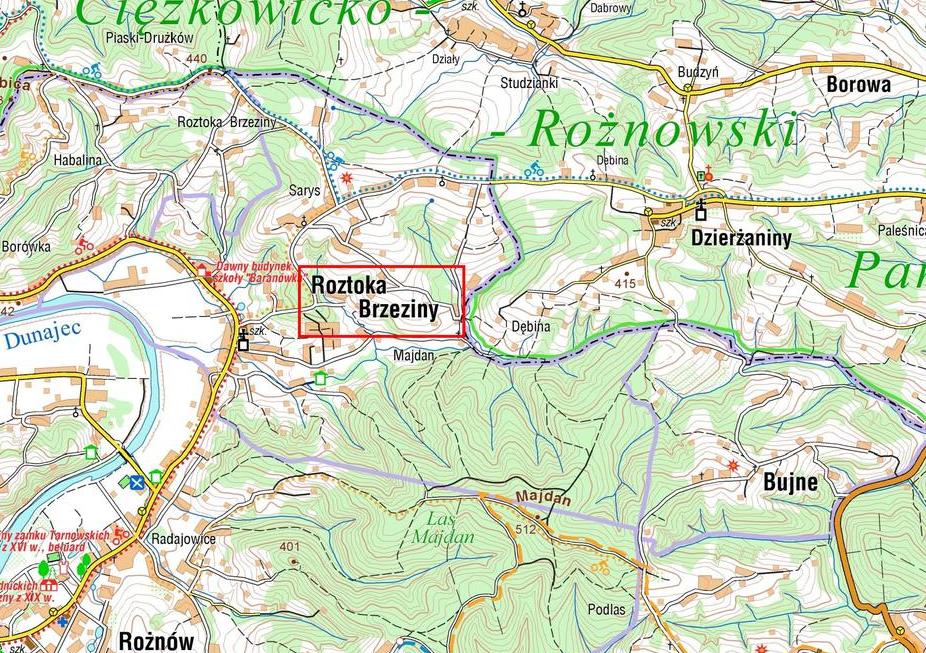 Najbliższa okolica to wymarzony teren do uprawiania niemalże każdego rodzaju turystyki. Cechą wyróżniającą miejscowość Roztoka - Brzeziny jest krajobraz i środowisko naturalne. Najbliższa okolica to tereny górzyste, liczne lasy, łąki, potoki górskie. Miejscowość posiada wysokie walory przyrodnicze wynikające z lesistego krajobrazu oraz ekologicznie czystego terenu. Roztoka - Brzeziny to malownicza wieś otoczona licznymi lasami, wzgórzami z przepięknymi widokami, położona wzdłuż przepływającej rzeki Dunajec. Znajduje się tu także najwyższe wzniesienie w gminie, góra Majdan położona na wysokości 512 m n.p.m. Górzysty krajobraz, duże zalesienie terenu, bezpośredni dostęp do wody ( rzeka Dunajec), dają możliwość aktywnego wypoczynku przede wszystkim w uprawianiu turystyki rowerowej, pieszej, wędkarstwa itp. Ważną zaletą Roztoki – Brzeziny są ekosystemy leśne. Są to lasy mieszane z przewagą dębu, buka, graba, jodły i sosny. Runo zbiorowisk leśnych jest niezwykle bogate, często z dużym udziałem gatunków chronionych i rzadkich. Pełno tu kurek, rydzy, maślaków, kozaków, prawdziwków czy osiczaków. Prawdziwy raj dla grzybiarzy i amatorów leśnych skarbów, jako że oprócz grzybów rosną również maliny, czarne jagody i inne leśne smakołyki. Na terenie wsi rosną gatunki roślin chronionych m.in. wawrzynek wilczełyko, skrzyp olbrzymi, parzydło leśne. Wieś Roztoka - Brzeziny ze względu na swoje walory przyrodnicze, a w dużej mierze piękne widoki, czyste powietrze i spokój znajduje uznanie wielu turystów. Niejednokrotnie wczasowicze przyjeżdżający nad Jezioro Rożnowskie po kilku dniach biernego wypoczynku na plaży, bardzo chętnie organizują sobie piesze bądź rowerowe wycieczki w dalsze zakątki gminy. Urozmaicona droga jest rajem dla rowerzystów, pokonując trasę przez Roztokę - Brzeziny mają ostre podjazdy, łagodne odcinki szczytem z wspaniałym widokiem na oddalony Dunajec i połacie lasów.