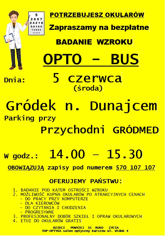 5 czerwca 2024 r. przeprowadzone zostaną bezpłatne badania wzroku dla mieszkańców gminy Gródek nad Dunajcem na parkingu przy Ośrodku Zdrowia w Gródku nad Dunajcem. Szczegóły na plakacie.
