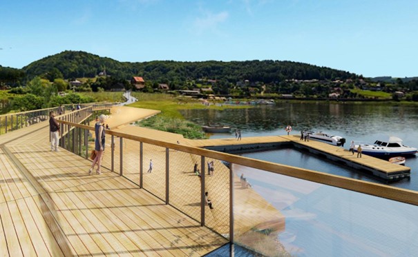 • Nowa promenada i pomost spacerowy – projekt obejmuje przebudowę trasy pieszej wraz z oświetleniem i miejscami do odpoczynku wśród zieleni, budowę ponad 200-metrowego molo nad jeziorem z przeszklonym punktem widokowym i tarasami plażowymi.