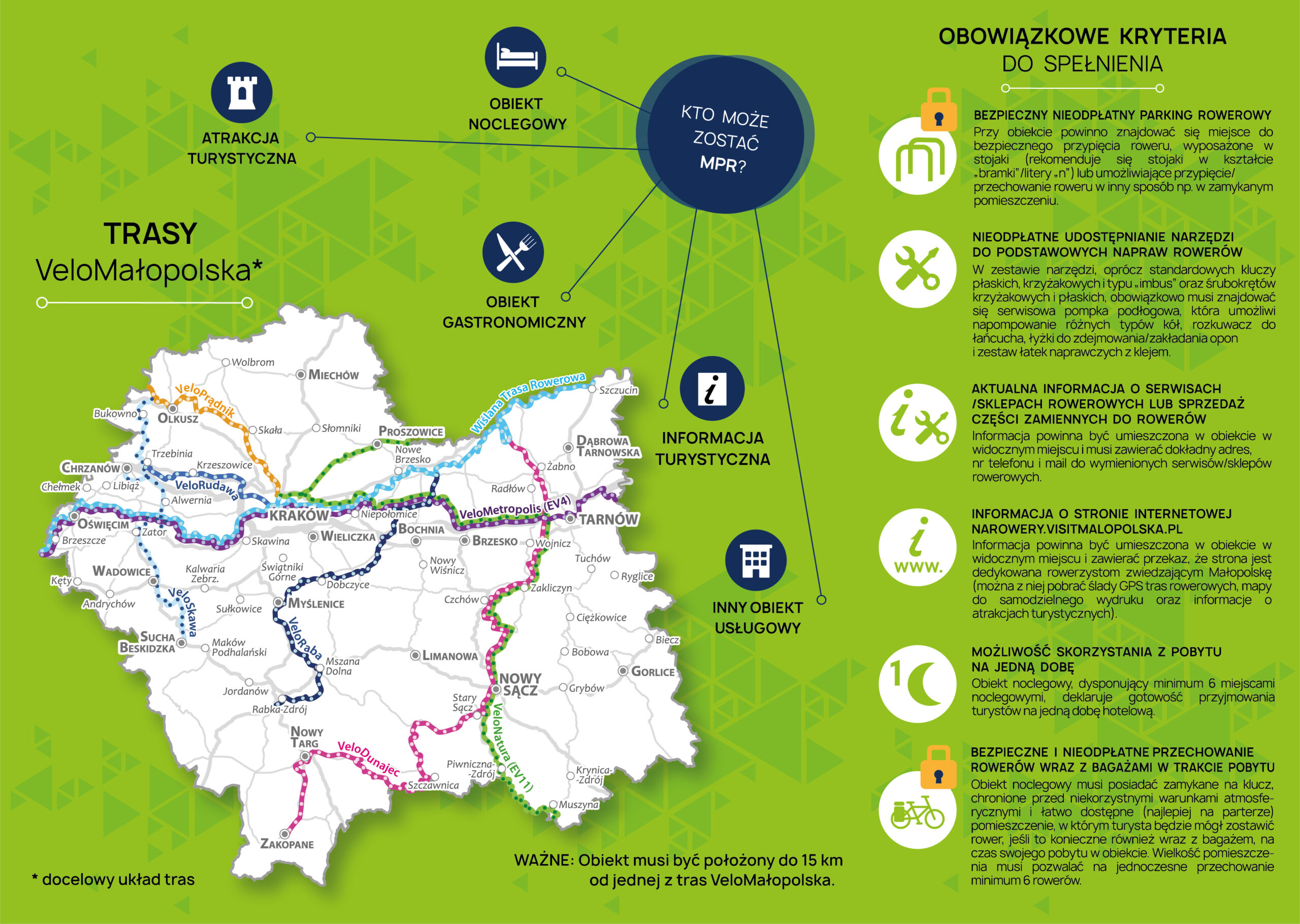 zlokalizowane (prowadzące działalność) w województwie małopolskim, w odległości nie większej niż 15 km od jednej z tras rowerowych sieci VeloMałopolska