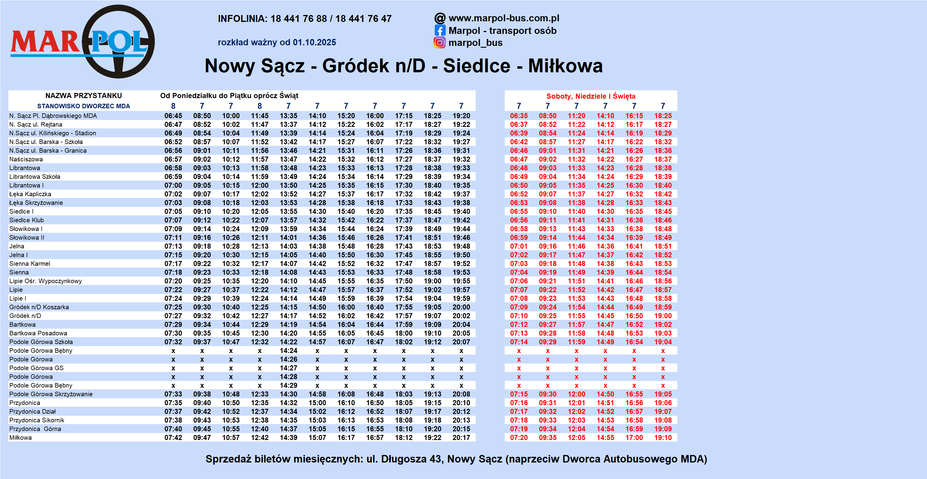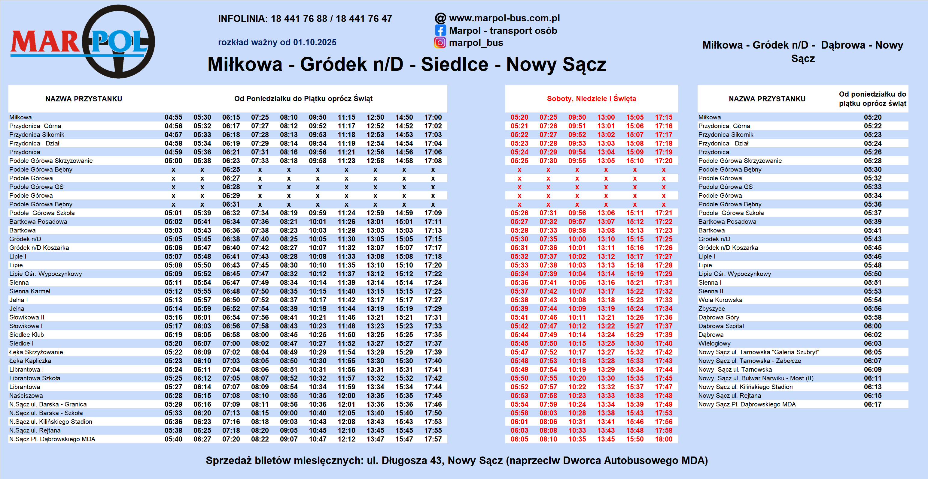 Rozkład jazdy na trasie Miłkowa-Nowy Sącz, Nowy Sącz-Miłkowa 06.10.2025 15:45 Treść Poniżej znajduje się rozkład jazdy na trasie Miłowa-Nowy Sacz, Nowy Sącz Miłkowa Facebook Twitter Email Drukuj