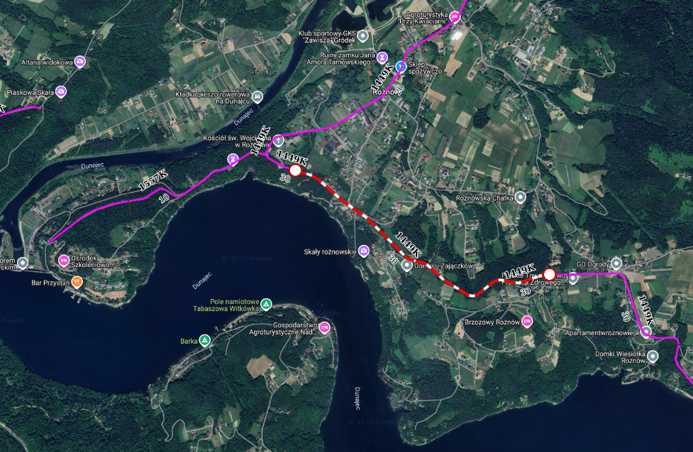 W związku z modernizacją drogi powiatowej nr 1449K Wytrzyszczka – Tropie – Bartkowa Posadowa w km 8+980 ÷ 10+830 w miejscowości Rożnów, od dnia 5 listopada 2025 roku do 22 grudnia 2025 roku droga na odcinku prowadzonych robót zostanie wyłączona z ruchu (z wyjątkiem dojazdu do posesji).