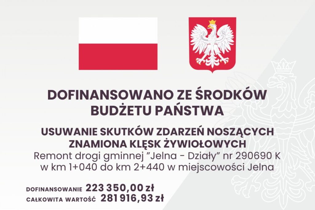 - Remont drogi gminnej ”Jelna – Działy” nr 290690K w km 1+040 do km 2+440 w miejscowości Jelna