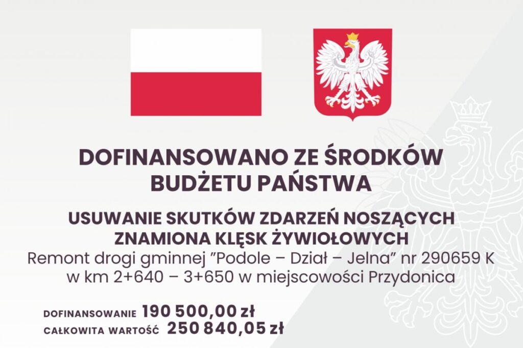 - Remont drogi gminnej ”Podole – Dział – Jelna” nr 290659K w km 2+640 – 3+650 w miejscowości Przydonica,
