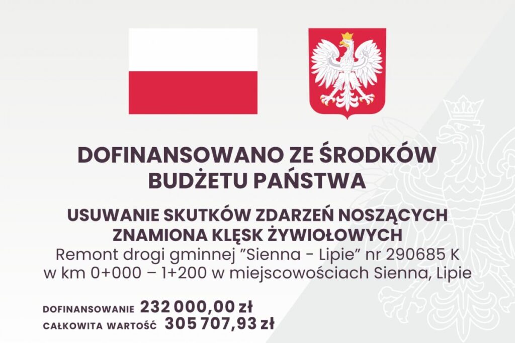 - Remont drogi gminnej ”Sienna – Lipie” nr 290685 K w km 0+000 – 1+200 w miejscowościach Sienna, Lipie
