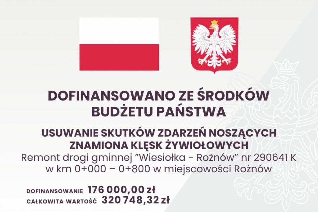 - Remont drogi: “Wiesiołka-Rożnów” nr 290641K w km 0+000 do 0+800 w miejscowości Rożnów