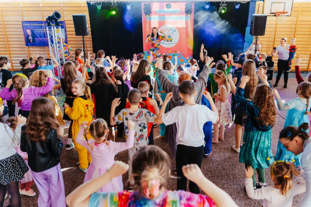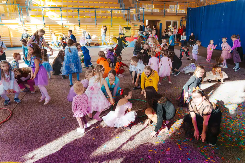 Na zakończenie ferii dzieci uczestniczyły w prawdziwej zabawie karnawałowej! O zabawy na najwyższym poziomie zadbała animatorka – były tańce, śpiewy, popcorn, zjeżdżalnie i mnóstwo radości. Na kilka godzin hala sportowa zamieniła się w baśniową krainę, a wystrój dopełniły kolorowe przebrania dzieci.