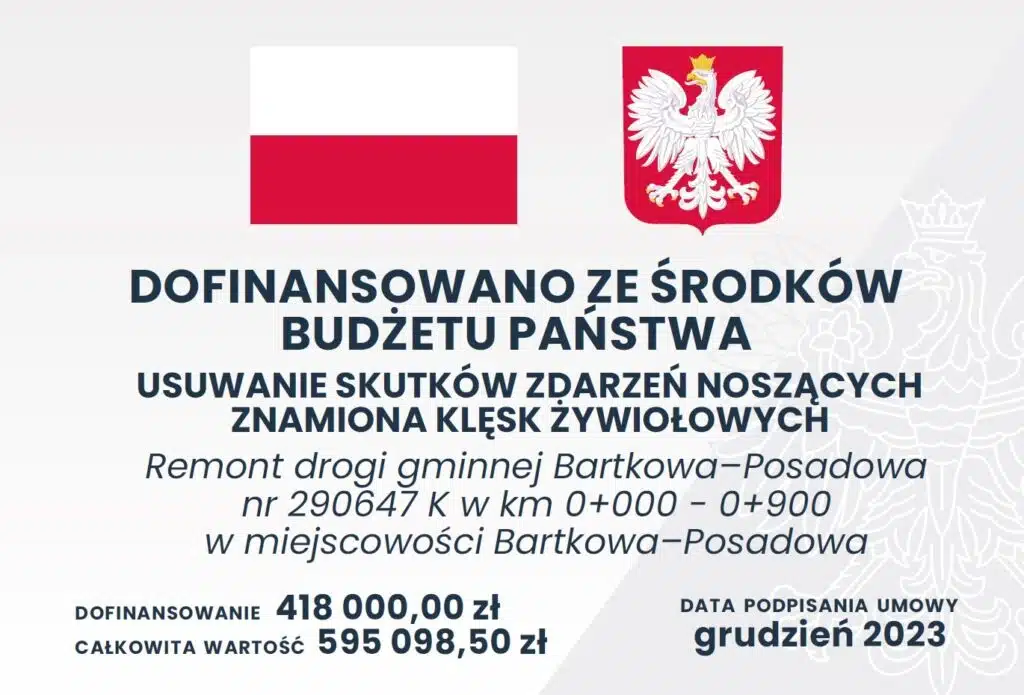 Remont drogi gminnej Bartkowa-Posadowa nr 290647 K odcinek w km 0+000 – 0+900 w miejscowości Bartkowa-Posadowa – wartość dofinansowania 418 000,00 zł