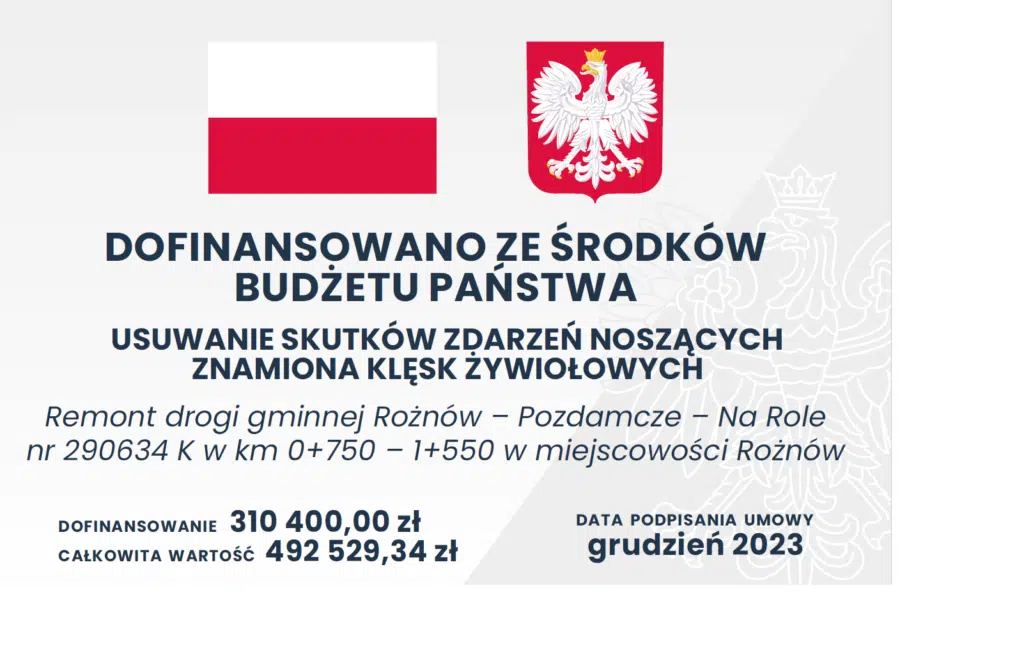 20 grudnia 2023 roku podpisano umowy nr WR-III.637.46.3.2023.DD i WR-III.637.46.2.2023.DD na wykonanie prac remontowych na odcinkach dróg uszkodzonych w bieżącym roku przez ulewne deszcze, na których remont przyznano wsparcie finansowe ze środków budżetu państwa.