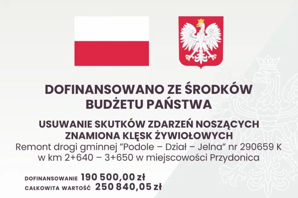- Remont drogi gminnej ”Podole – Dział – Jelna” nr 290659K w km 2+640 – 3+650 w miejscowości Przydonica.