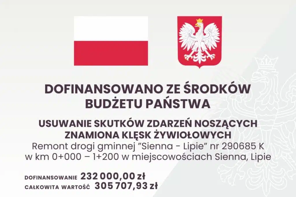 - Remont drogi gminnej ”Sienna – Lipie” nr 290685 K w km 0+000 – 1+200 w miejscowościach Sienna, Lipie.