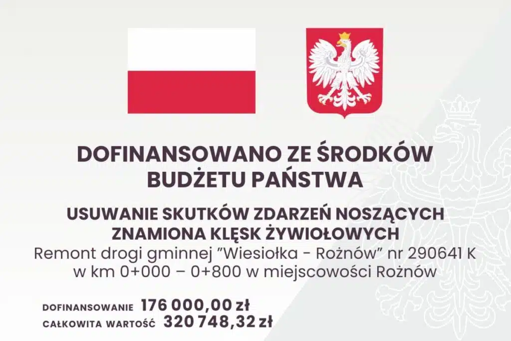 - Remont drogi: “Wiesiołka-Rożnów” nr 290641K w km 0+000 do 0+800 w miejscowości Rożnów.