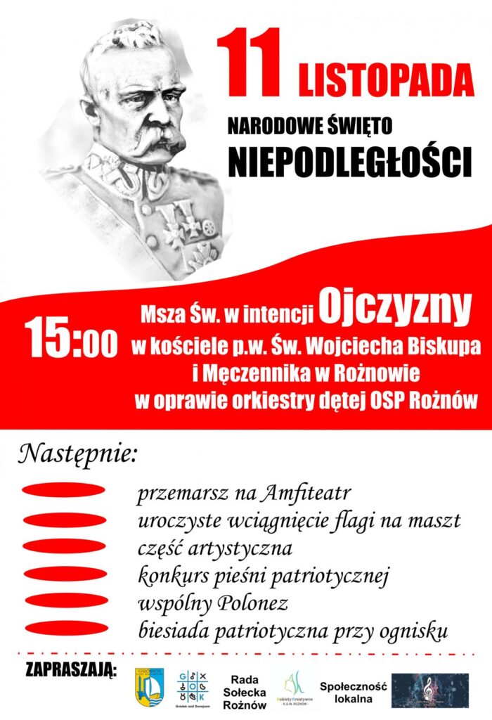 Zapraszamy na Gminne Obchody Odzyskania Niepodległości, które rozpoczną się uroczystą Mszą Świętą za Ojczyznę z udziałem Orkiestry Dętej OSP Rożnów o godzinie 15:00 w Kościele p.w. Św. Wojciecha Biskupa i Męczennika w Rożnowie.